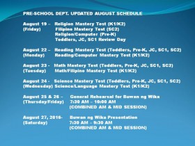 Due to weather disturbance and class cancellation, please be informed of our updated schedule for August for the Pre-school, Grade School and High School Departments.