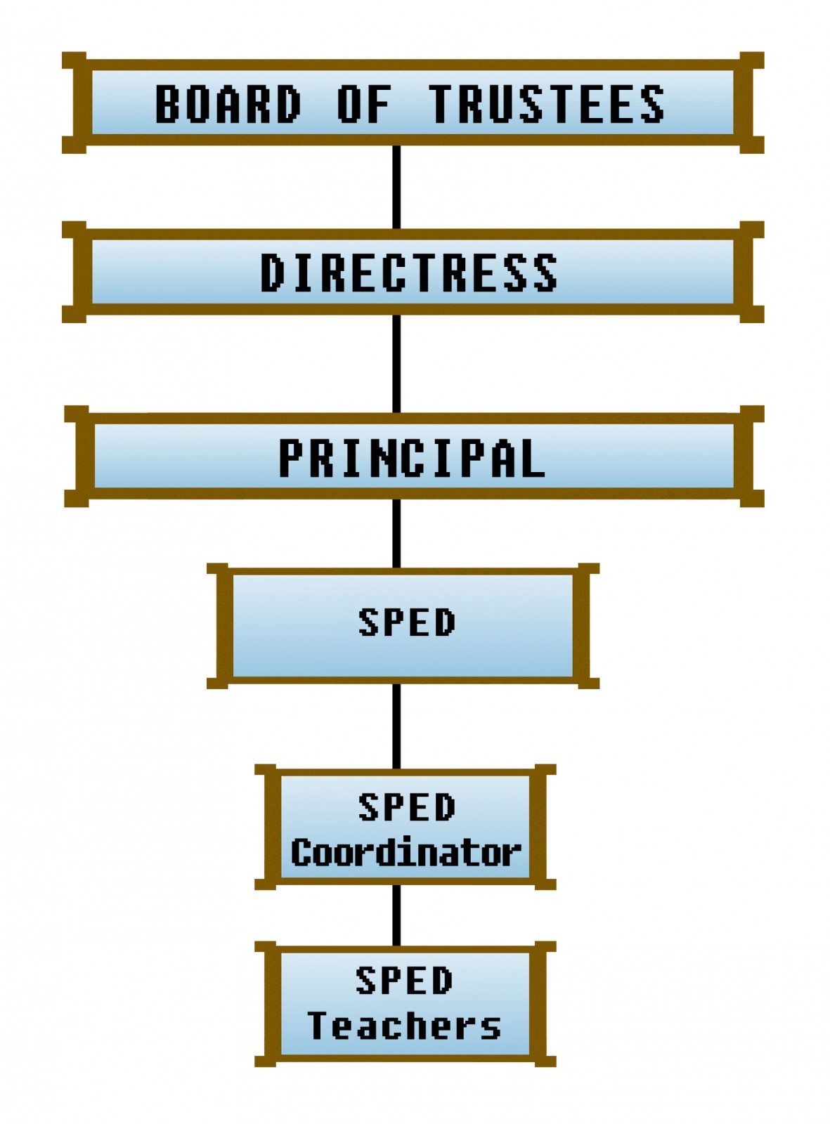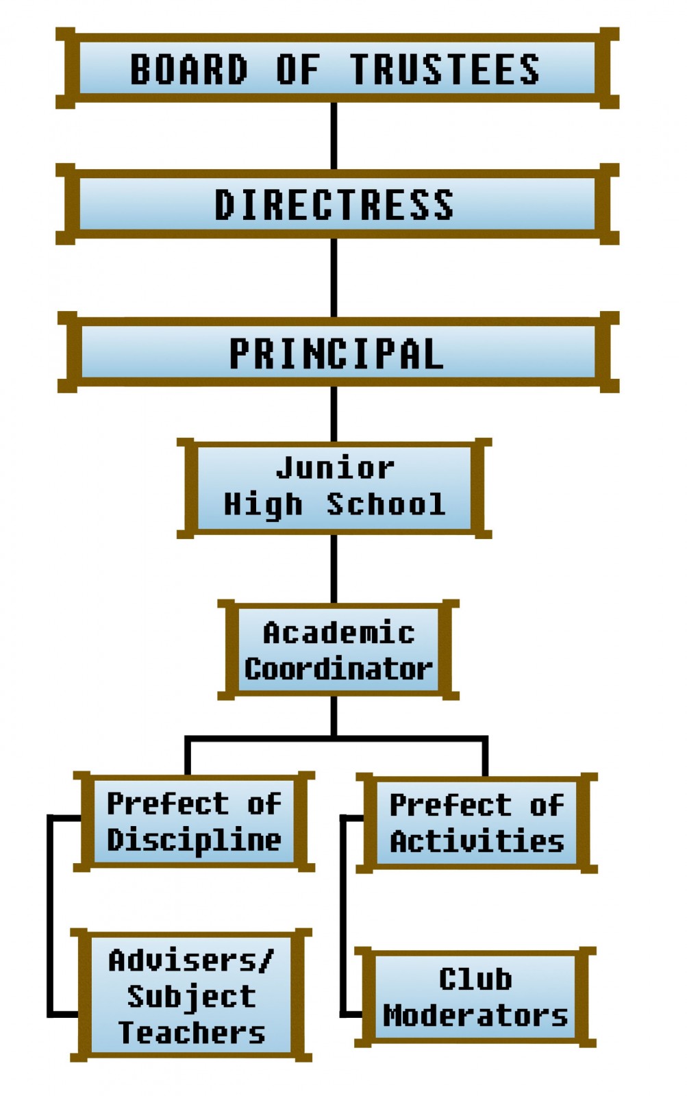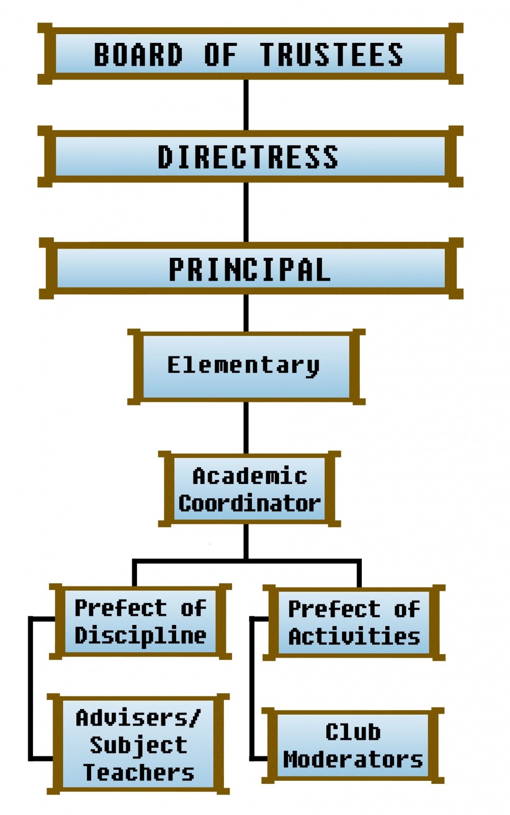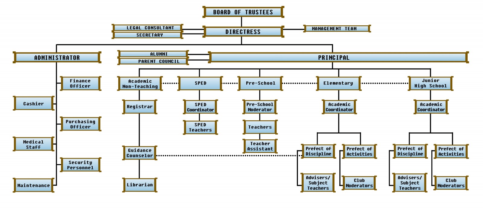 An organizational structure reflects the key personnel of the school and indicates clearly the line of communication and authority of the officials thus facilitates efficient and effective attainment of the mission and organizational goals of the school.